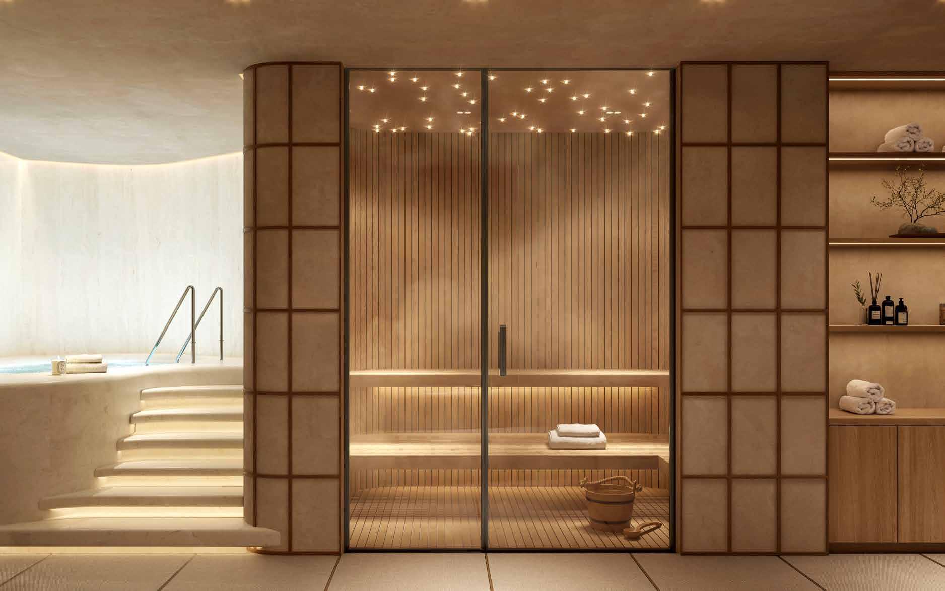 Residents of the complex have access to exclusive amenities: a double-height lobby, a bathhouse, a concierge, a children’s playground, a rooftop pool area, a sauna and ice bath, a tea room, a gym, etc.