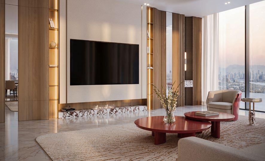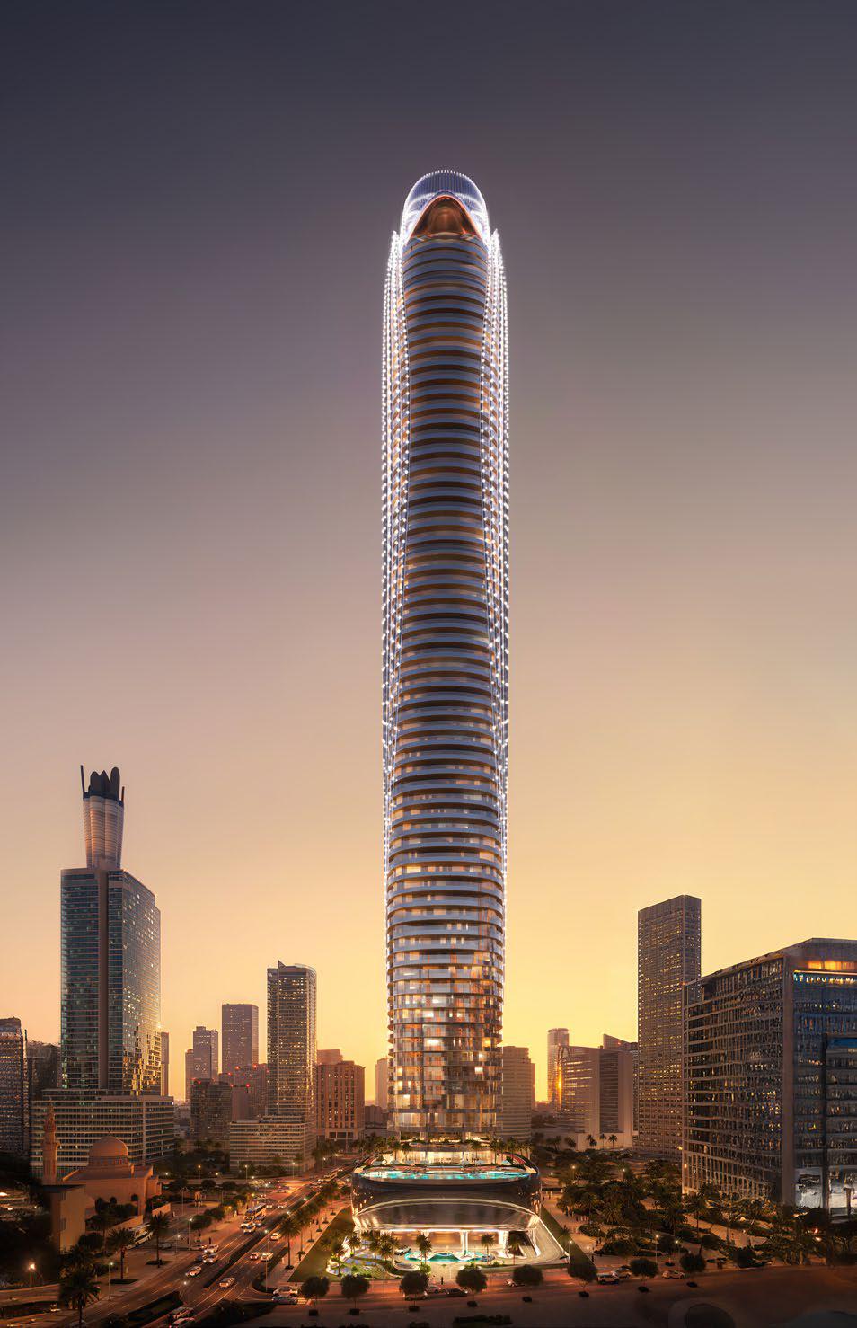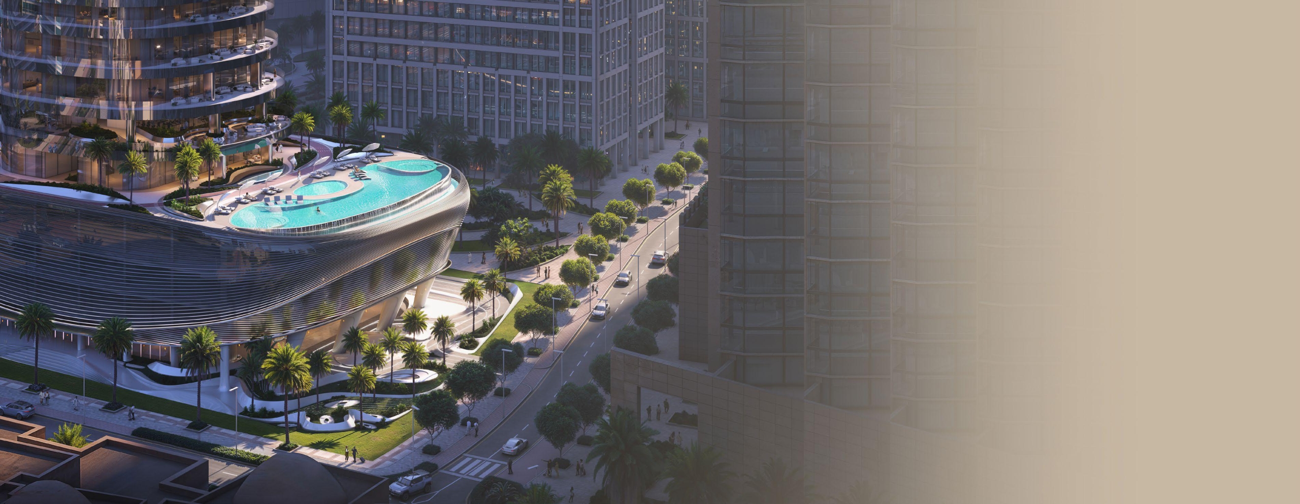 The tower stands out with a modern silhouette, crystalline glass façades, and satin-finish metal accents. Dynamic balconies complement the design, while select residences feature private pools. Interiors are crafted from premium materials in soft tones and enhanced with floor-to-ceiling panoramic windows overlooking Burj Khalifa, Dubai Water Canal, and Downtown Dubai, filling the spaces with light and air.